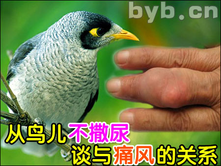 【byb.cn 大鳥(niǎo)】痛風(fēng)的成因大家應(yīng)該知道一二,因?yàn)槟蛩猁}結(jié)晶、沉積,覆蓋在人體骨骼關(guān)節(jié)位置,產(chǎn)生反應(yīng)性關(guān)節(jié)炎或痛風(fēng)石。 上了點(diǎn)年紀(jì)的人大概知道一句俗語(yǔ):“鳥(niǎo)兒不撒尿,各有各的道”。別看這句民間俏皮話似乎有點(diǎn)粗俗,但細(xì)琢磨起來(lái)還真有點(diǎn)意思。結(jié)合那本文的標(biāo)題,鳥(niǎo)兒不撒尿和痛風(fēng)有關(guān)系嗎?還真有關(guān)系,而且關(guān)系還不是一般的深。假如俺們有鳥(niǎo)兒的本事,或許困擾很多人的痛風(fēng)病就不存在了。