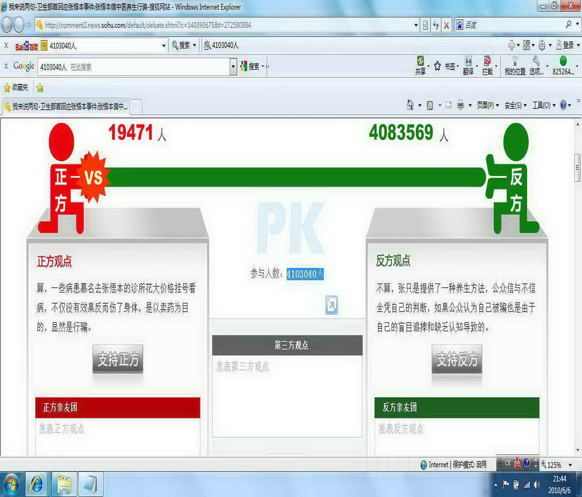 2010年6月5日,針對衛(wèi)生部發(fā)言人認為有人借中醫(yī)行騙一事,搜狐的調(diào)查