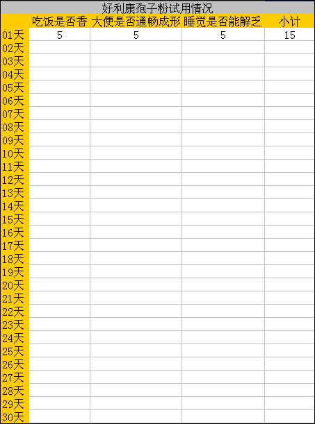 注意:吃飯、大便、睡覺,每一小項滿分為5分,請如實填寫