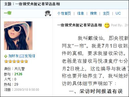 ? 我叫戴俊仙,即央視新聞?lì)l道2011年7月23日新聞?wù){(diào)查《馬悅凌神話》節(jié)目中接受采訪的網(wǎng)友“一簾”。