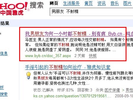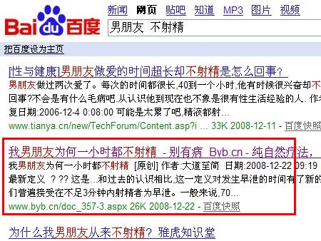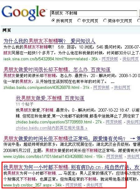 以本站昨天(2008年12月22日上午10點(diǎn))發(fā)的文章,我男朋友為何一小時(shí)都不射精為例,23日18點(diǎn)搜索查詢(xún)結(jié)果: