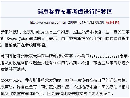 新浪科技訊 北京時間1月16日上午消息,據(jù)國外媒體報道,據(jù)一直關注蘋果CEO史蒂夫·喬布斯(Steve Jobs)病情的人士表示,由于喬布斯在2004年治療胰腺癌過程中引起了術后并發(fā)癥,目前他正在考慮肝移植。