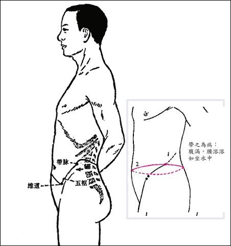 《素問·二十九難》說:“帶之為病,腹?jié)M、腰溶溶若坐水中”。如帶脈不和,可見婦女月事不調(diào),赤白帶下等癥?!端貑枴ゐ粽摗罚骸瓣柮魈搫t宗筋縱,帶脈不引,故足痿不用?!闭f明帶脈失調(diào),可發(fā)生痿癥。在王叔和的《脈經(jīng)》里,也有“診得帶脈,左右繞臍腹、腰脊痛沖陰股”等癥的敘述。