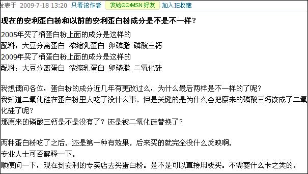 其實(shí),安利公司曾經(jīng)也在其蛋白粉中采用過(guò)磷酸三鈣,不過(guò)那似乎是很早的事了(05年前)。大家看這段帖子:http://bbs.hualongxiang.com/thread-5411597-1-1.html